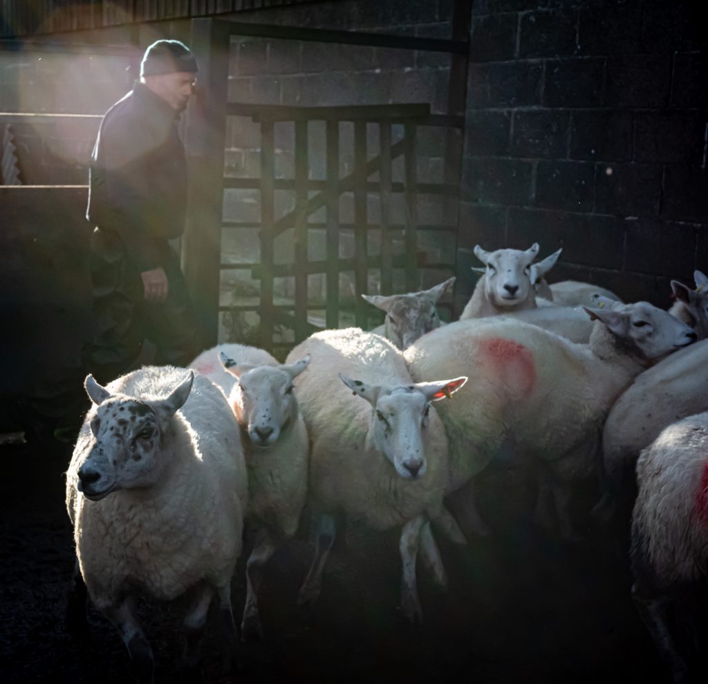 Our 1,200-strong breeding flock of Texels crossed with North Country Mules is well suited to the wet conditions and sometimes brutal winters that prevail on our fields and moorlands. They are bred to thrive outdoors, coming inside only for lambing.
